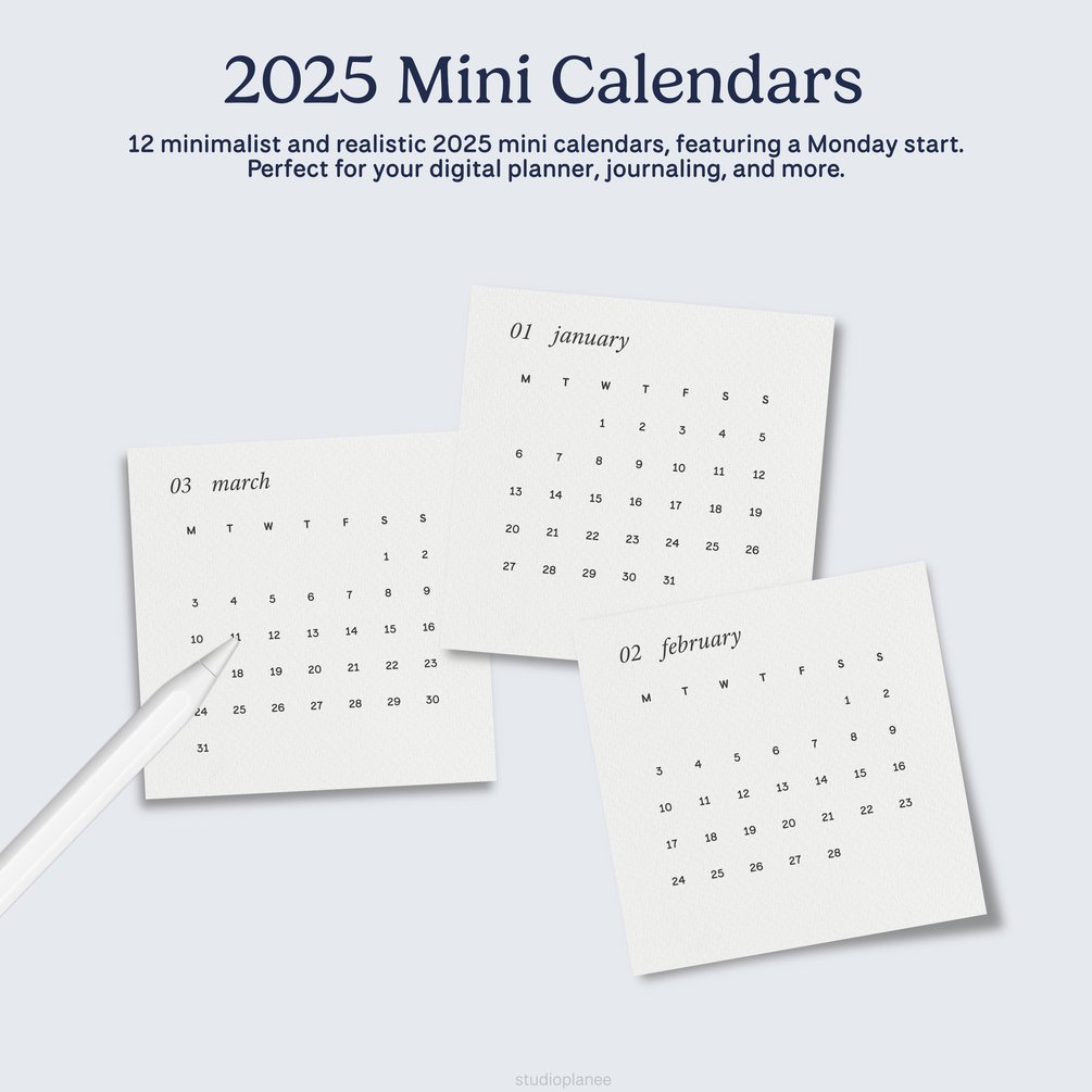 Elevate your digital planning with these 2025 minimalist and realistic mini calendar stickers. Perfectly designed for a clean, organized look, featuring a Monday start.